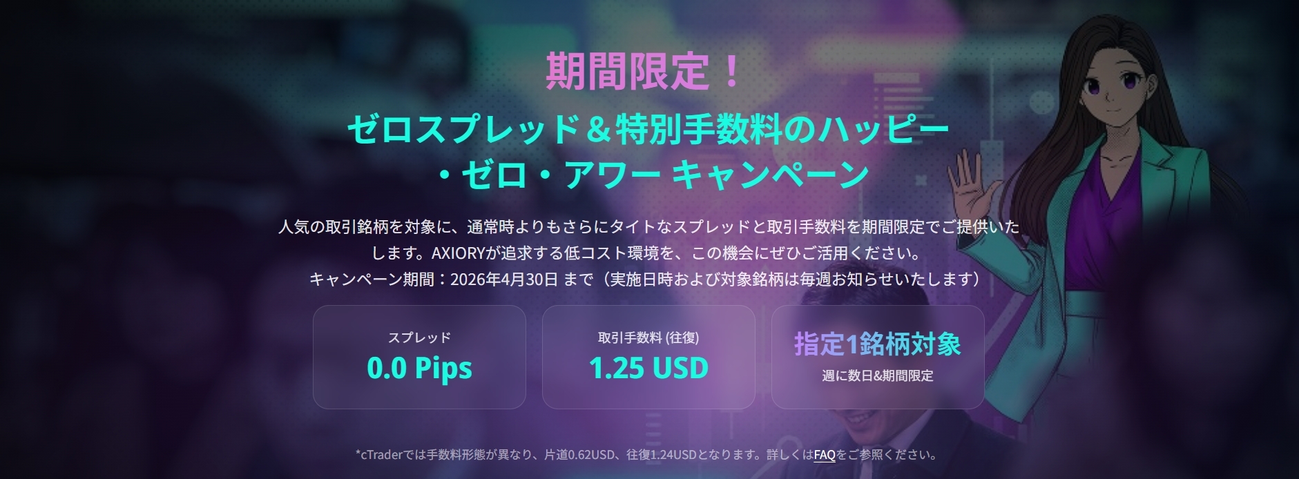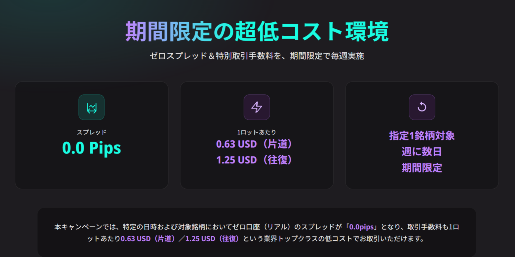 人気の取引銘柄を対象に、通常時よりもさらにタイトなスプレッドと取引手数料を期間限定でご提供いたします。AXIORYが追求する低コスト環境を、この機会にぜひご活用ください。