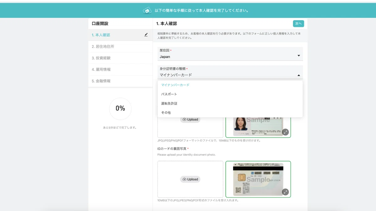 パスワード設定が完了したら、本人確認へ移ります。 使用できる身分証明書は以下の通りです。