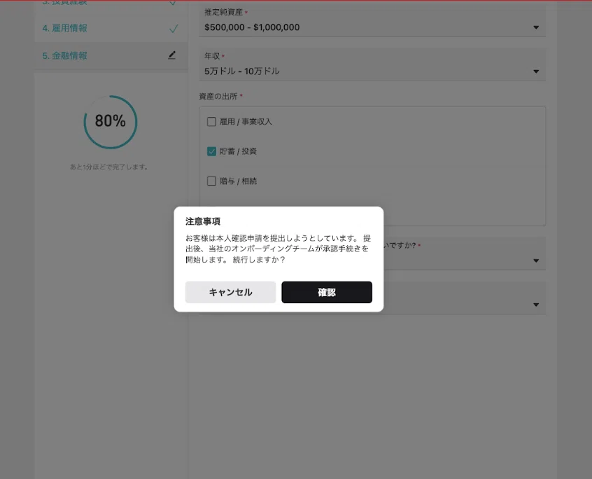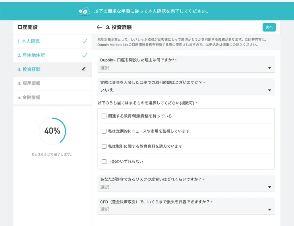 「投資経験」「雇用情報」「金融情報」を選択形式で入力します。
