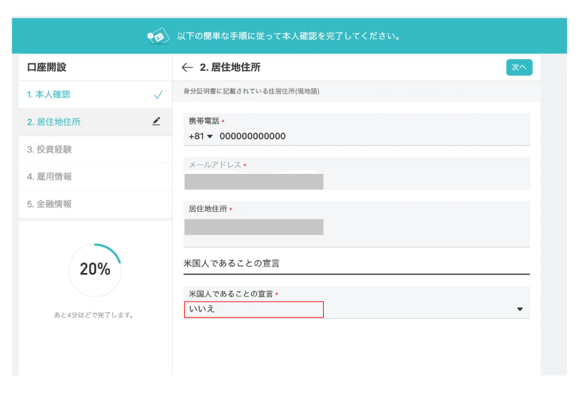 住所・投資情報の入力: 画面の指示に従って、居住地や投資経験を選択・入力していきます。
