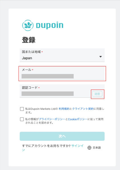 1.居住国を選択し、メールアドレスを入力します。