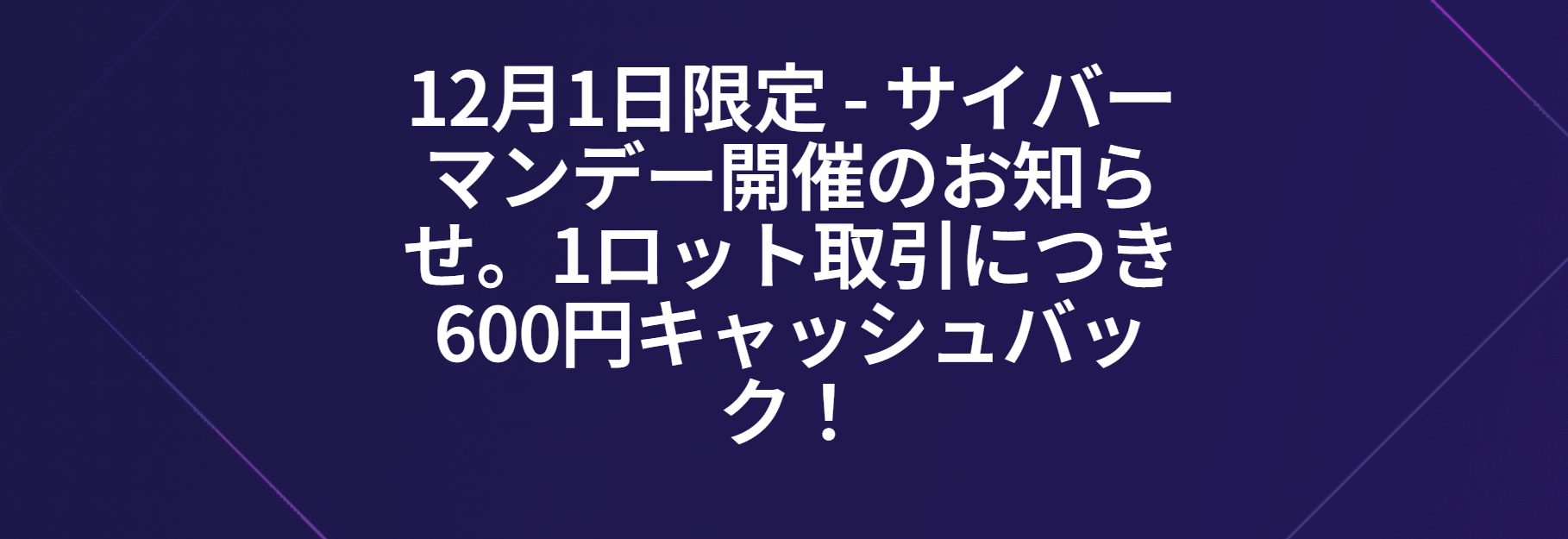 大好評をいただいたブラックフライデーキャッシュバックを延長し、12月1日より1日限定で全FXとゴールド取引1ロット取引につき600円キャッシュバックの「サイバーマンデーキャッシュバック」を開催いたします。