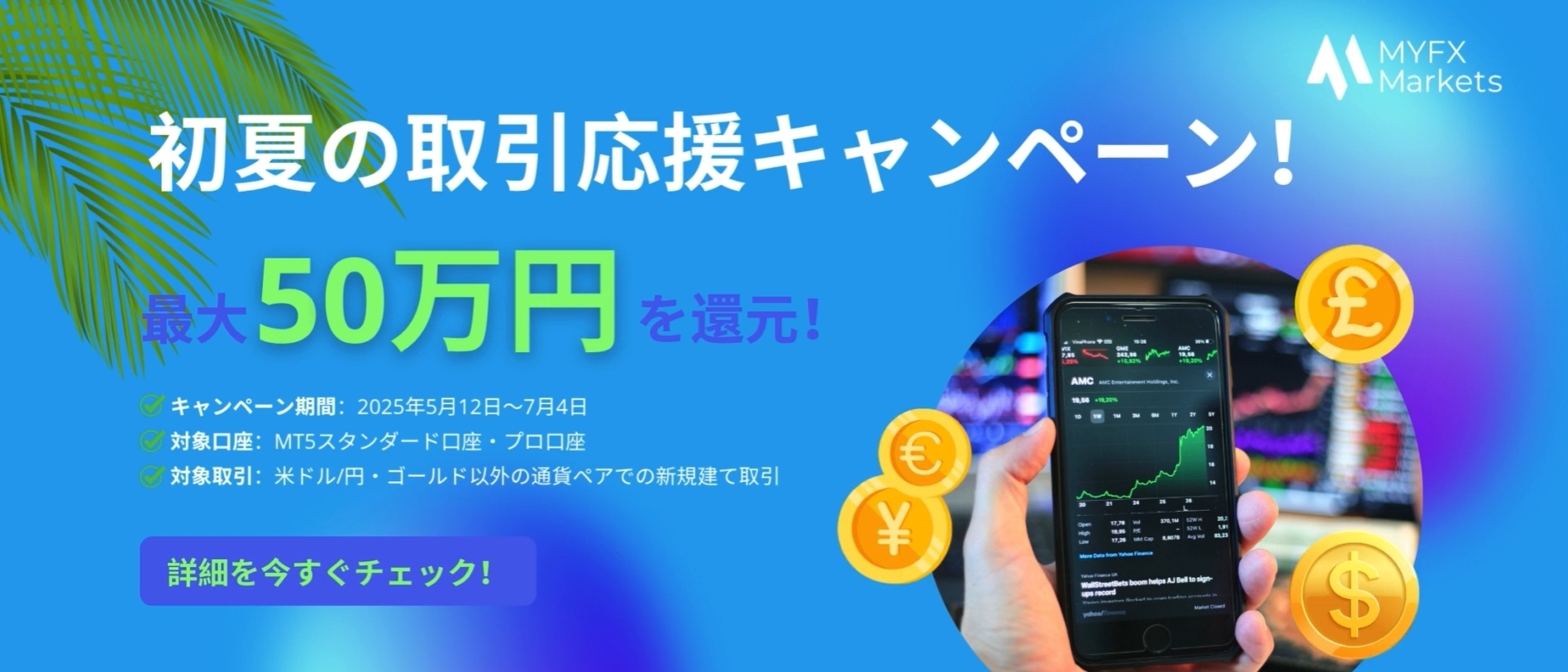 MYFX Marketsでは、初夏の取引を応援する特別キャンペーンを実施いたします。 期間中、MT5スタンダード口座またはプロ口座で、米ドル/円とゴールド以外の通貨ペアを合計5万通貨以上新規建て取引されたお客様に、取引量に応じて最大50万円のキャッシュバック(現金)を実施いたします。